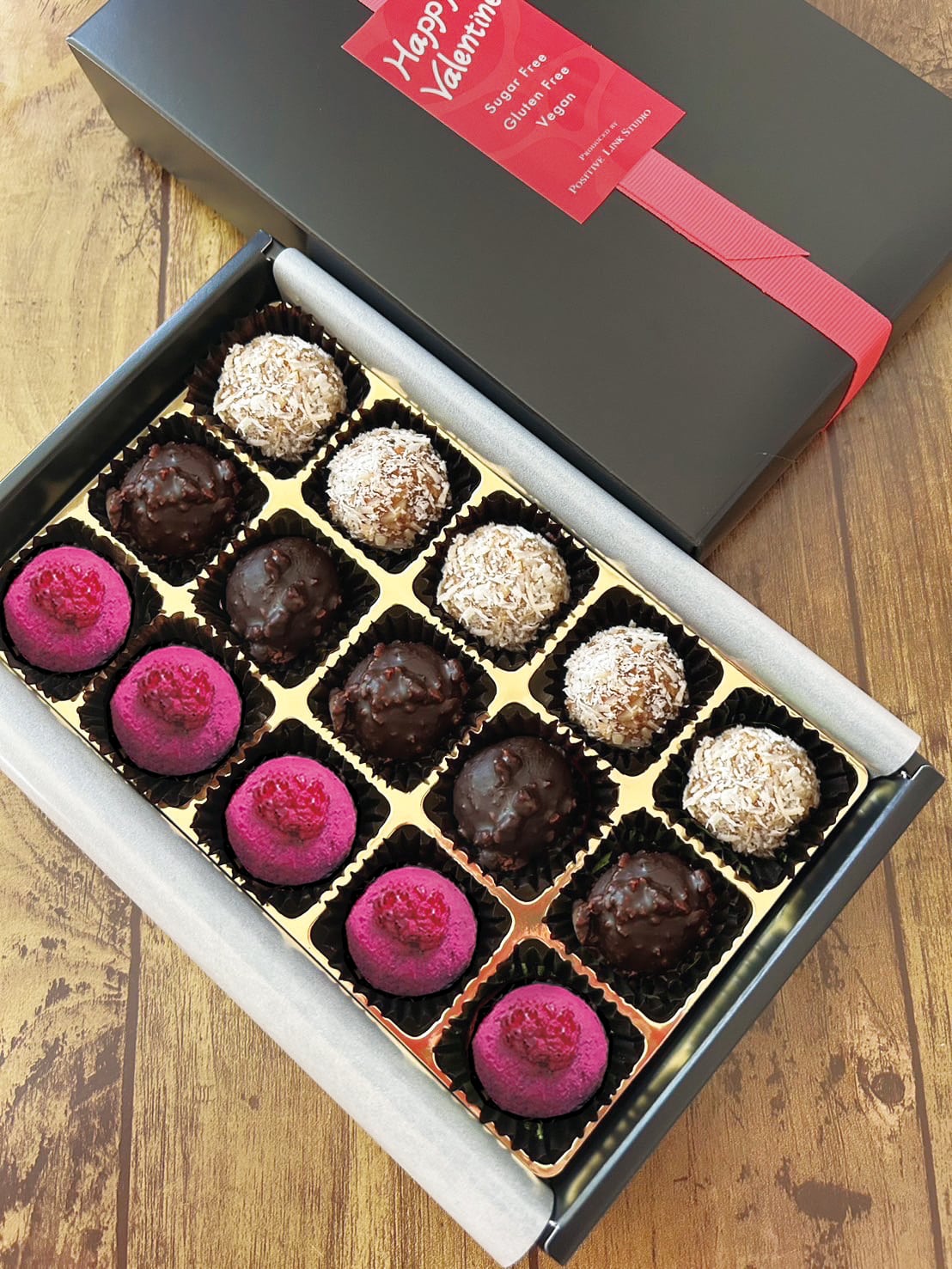 上品なローズと大粒のヘーゼルナッツを濃厚なデーツで包み、ヘーゼルナッツパウダーとアーモンドチョコレートでコーティングしたショコラのそして大人気ラズベリーのセットです!