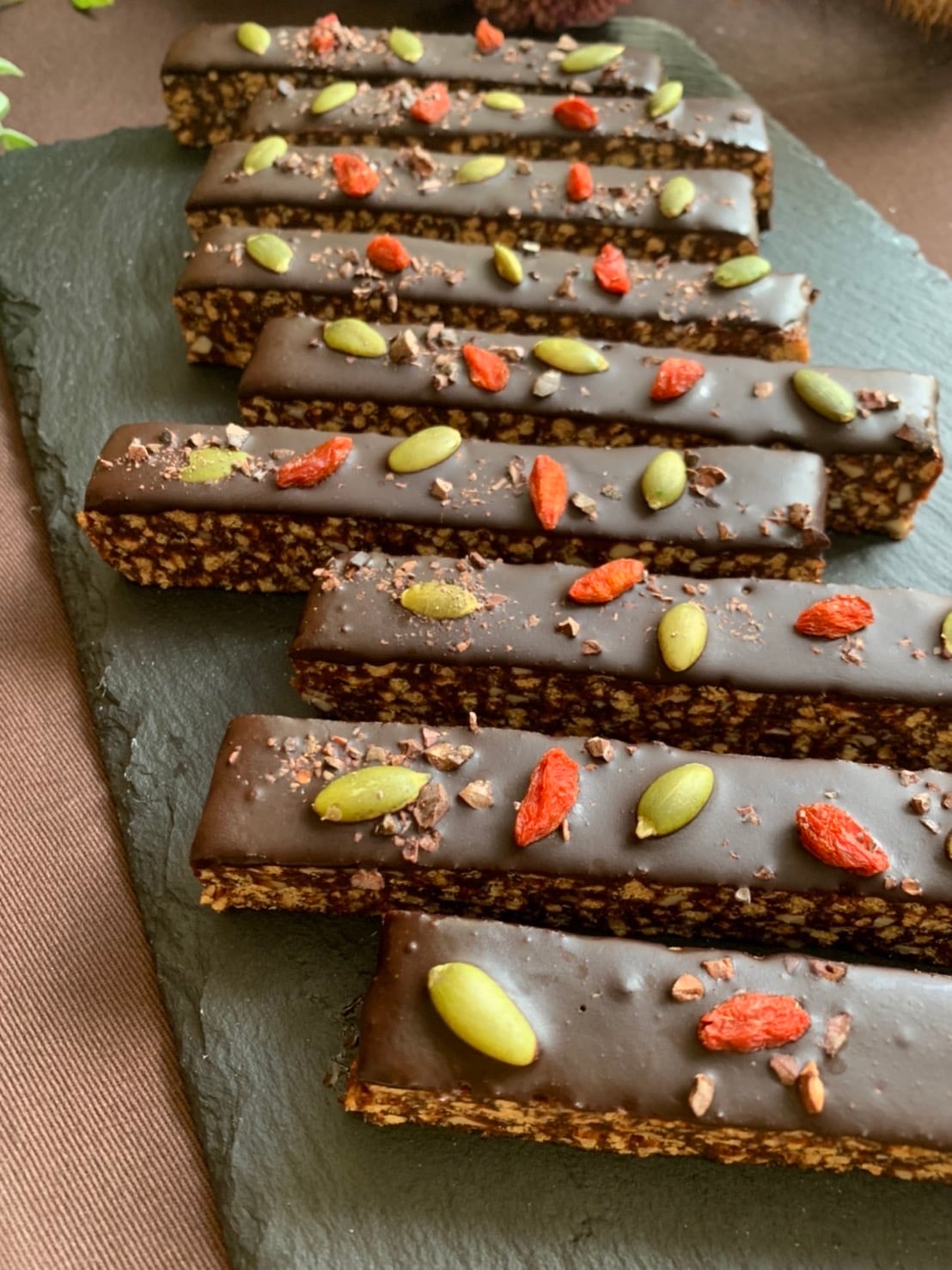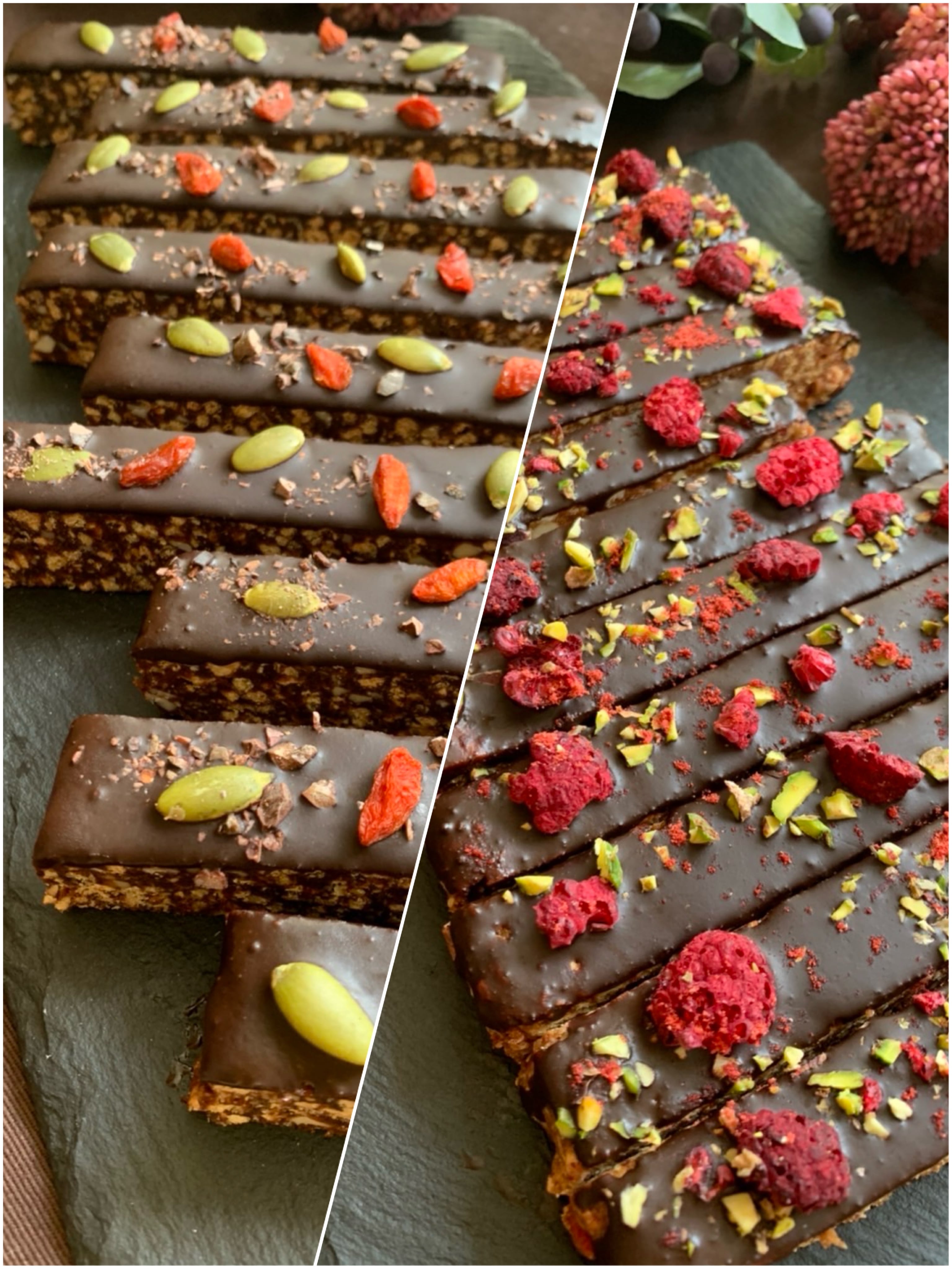 フルーツやナッツをカカオでコーティングした生のプロテインバー。